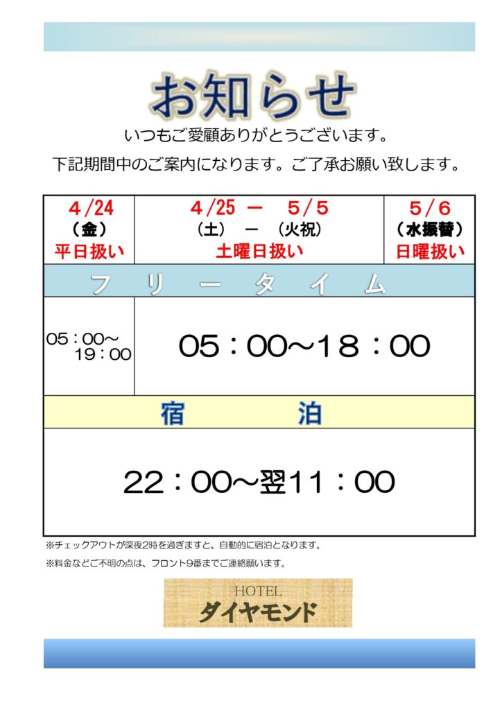 いつもホテルダイヤモンドをご利用いただき、誠にありがとうございます。