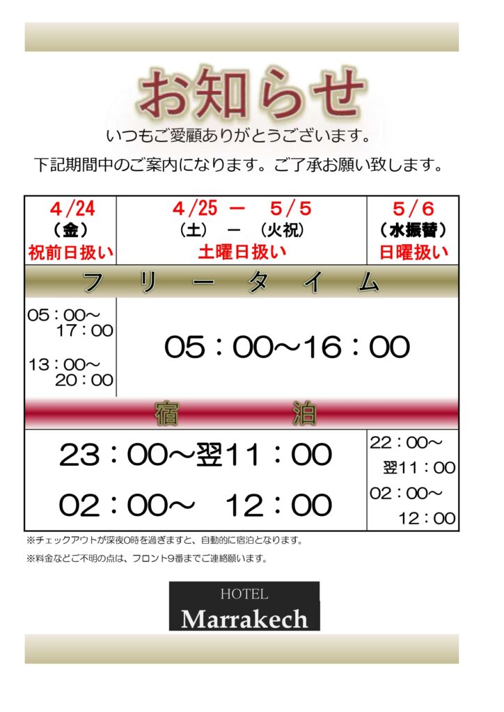 いつもホテルマラケッシュをご利用いただき、誠にありがとうございます。