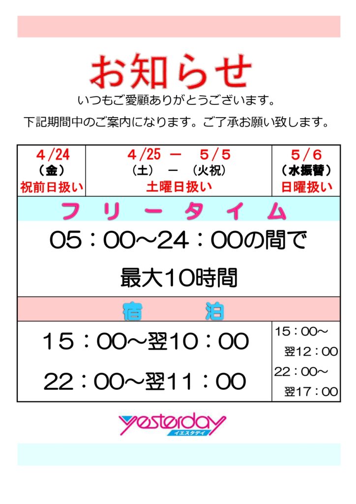 いつもホテルイエスタデイをご利用いただき、誠にありがとうございます。